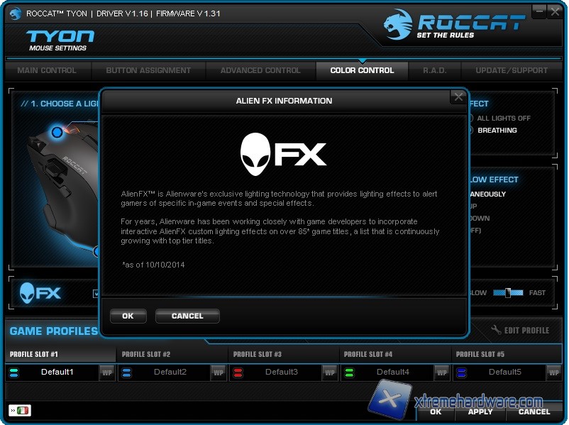 Procediamo con il Menù ‘’Color Control’’ dal quale potremo regolare ed impostare i diversi effetti di retroilluminazione o i colori sia per lo Scroll che per il bordino inferiore. Come dicevamo potremo assegnare un diverso colore per le due zone e quindi rendere personalizzato il mouse secondo i nostri gusti estetici. Troviamo anche la funzione Alien FX utilizzabile solo con PC ed accessori Alienware.