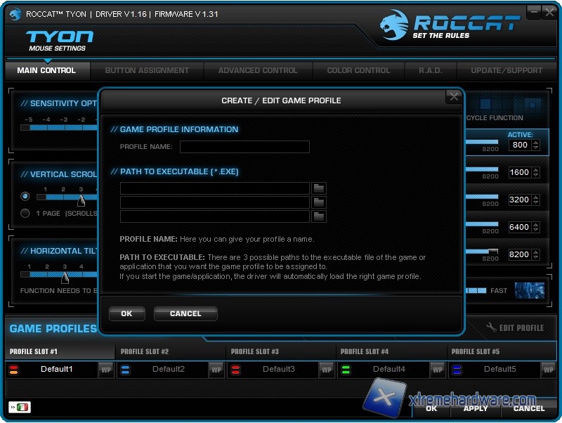 Avviato il software di gestione, avremo come sempre una grafica scarna di immagini ma ricca di impostazioni da regolare ed impostare a nostro piacimento, secondo gli utilizzi che faremo del mouse. La schermata principale, chiamata ‘’Main Control’’, è caratterizzata dalla presenza di diverse barre con slides che ci permetteranno di regolare la sensitività del mouse, la velocità di Scroll, i DPI ed i vari step e di creare ed editare i 5 profili disponibili. Non manca anche la regolazione della velocità della pinna/tasto presente sul dorso del mouse. I DPI potranno essere regolati solo a step di 200 e non di 50 o 100. Non crediamo sia un grave difetto per i classici videogiocatori. Non manca la possibilità di disabilitare gli altri step di DPI deselezionando la spunta in corrispondenza dello step. Per finire potremo anche cambiare la lingua del software di gestione che in questo caso è già settata in Italiano.